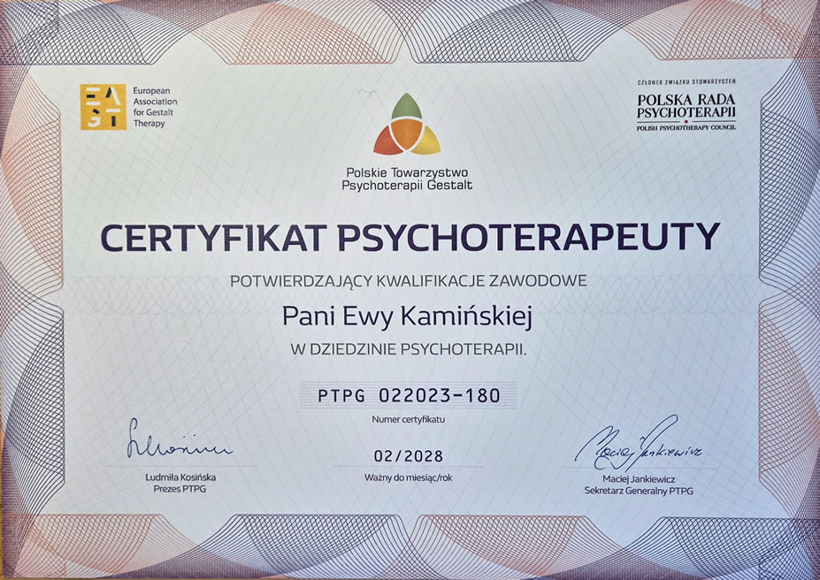 Jestem członkiem Polskiego Towarzystwa Psychoterapii Gestalt. Pracuje pod stałą superwizją u certyfikowanych superwizorów Gestalt i Polskiego Towarzystwa Psychologicznego. Regularnie dokształcam się uczestnicząc w warsztatach i szkoleniach specjalistycznych.